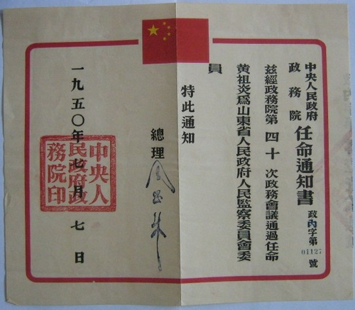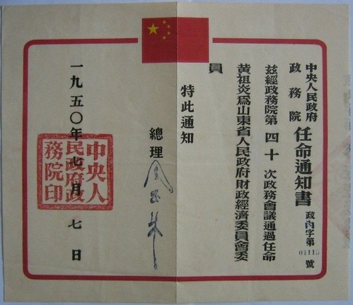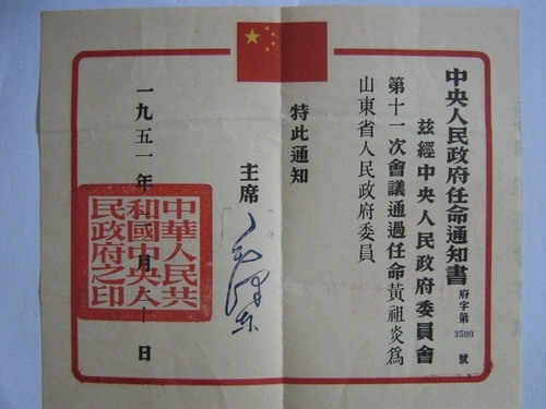 毛泽东主席签发的黄祖炎任命书