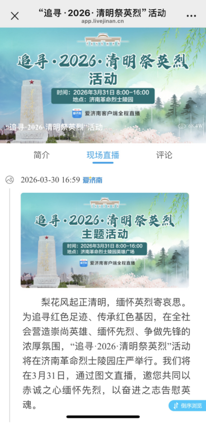 梨花风起,清晖凝思。英雄山下的松柏翠影间,一抹红色信仰在清明的追思中愈发炽热。按照省、市有关工作部署,3月31日至4月6日,济南革命烈士陵园提前谋划、精心组织,全力保障“追寻·2026·清明祭英烈”活动安全有序开展。活动期间,累计接待祭扫参观群众16.3万余人次,团队1300余个,云祭扫3.6万余人次,其中,纪念馆参观人数5.5万余人次,讲解500余场。