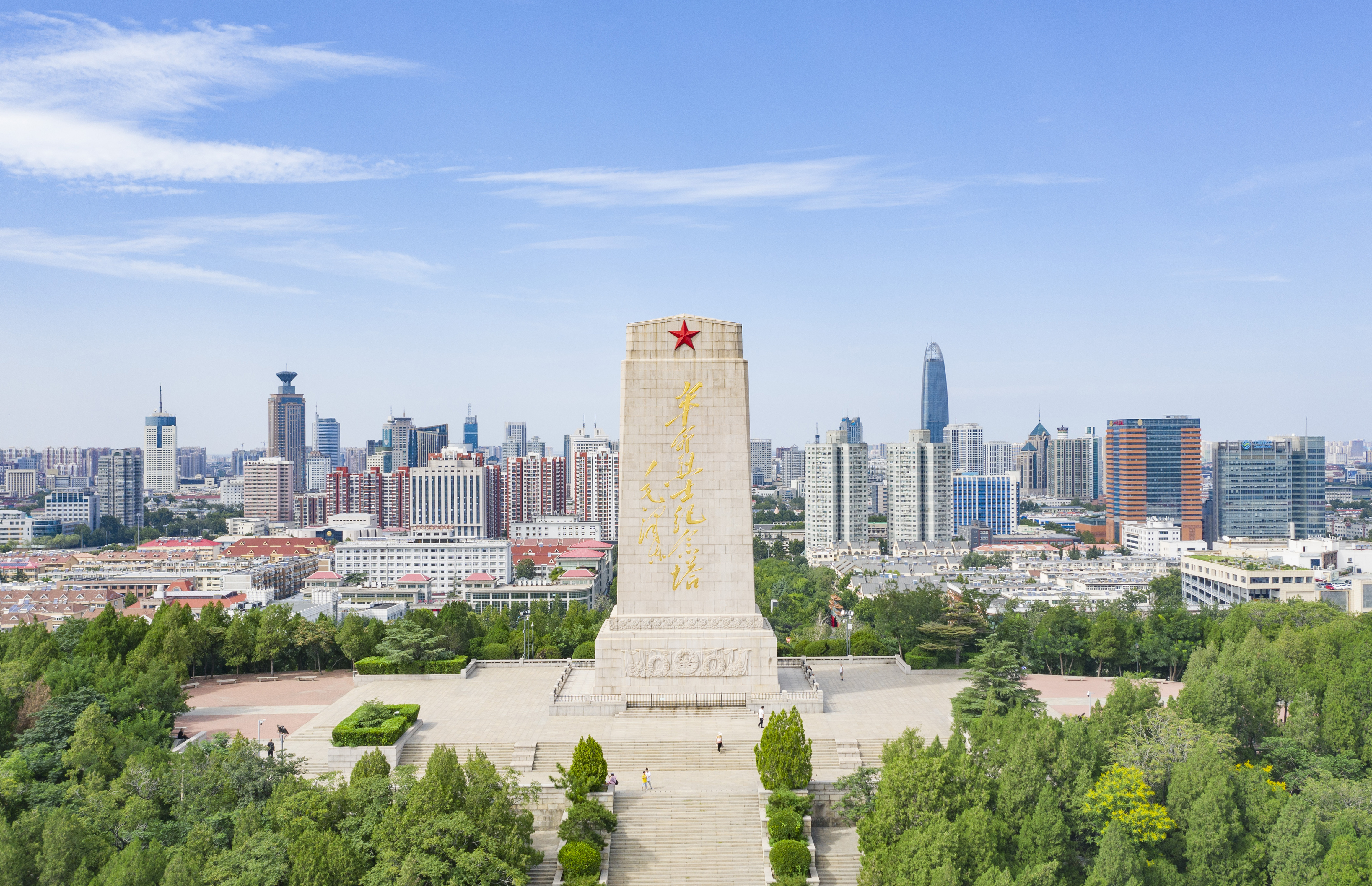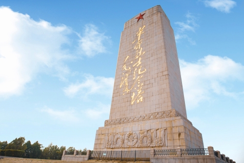 1948年12月24日,中共中央华东局扩大会议决定修建革命烈士纪念塔。1949年6月,毛泽东主席亲笔为纪念塔题词:“革命烈士纪念塔”。1949年11月28日,纪念塔工程在四里山顶(今英雄山)开工建设,1968年工程竣工后,毛泽东主席题写的“革命烈士纪念塔”连同“毛泽东”三个字经放大后刻在纪念碑南北两面。纪念塔巍峨挺拔,高耸入云。塔座上花环图案的艺术雕刻寄托了人们对革命烈士的敬仰与哀思,顶端镶刻的红色花岗岩雕凿的五角星,宛然是烈士热血凝结,光彩四射,辉映千秋。