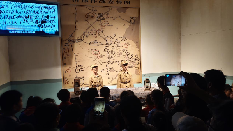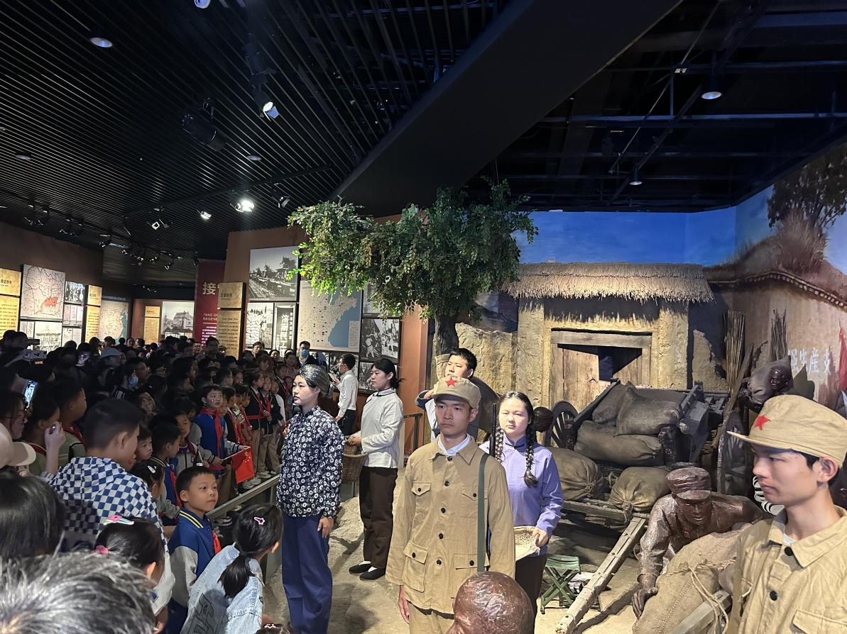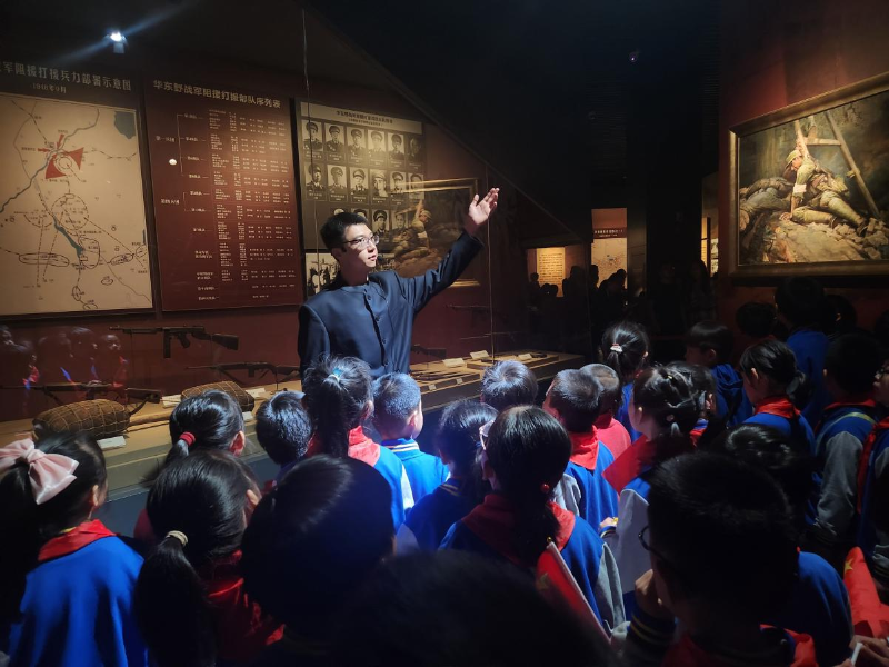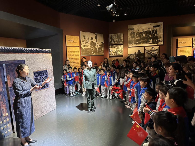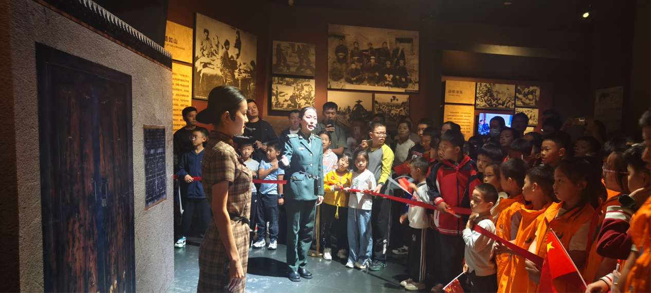 专业讲解员、小小讲解员和来自济南大学戏剧社团的志愿者在展厅多个点位展演红色剧目,将舞台剧表演与纪念馆展陈讲解相融合,为观众提供沉浸式参观体验,增强红色文化的感召力和吸引力,根植红色基因,厚植爱国情怀。